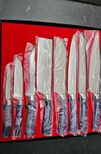 • Striking violet marbled handles — bold, elegant, and unique